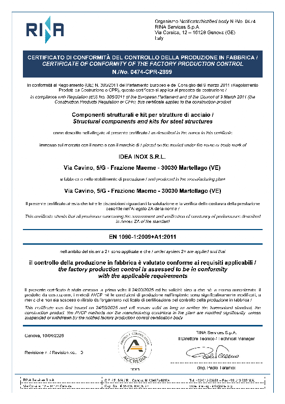 RINA (Royal Institution of Naval Architects) è un ente terzo accreditato che effettua la valutazione della conformità e rilascia tali certificazioni, verificando il controllo della produzione in fabbrica (FPC) dell'azienda e la sua capacità di produrre componenti strutturali conformi, come strutture in acciaio e alluminio, per il mercato europeo.